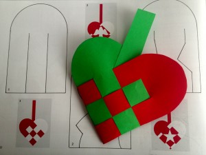C’est une décoration typiquement Danoise. La tradition l’attribue à Hans Christian Andersen (1805-1875), l’auteur des Contes. Traditionnellement ces paniers en forme de coeurs sont réalisés sans collage. Le tressage demande beaucoup de patience et de concentration. Le principe est qu’une bande blanche sur deux est glissée à l’intérieur d’une bande rouge, et une bande rouge sur deux est glissée à l’intérieur d’une bande blanche.