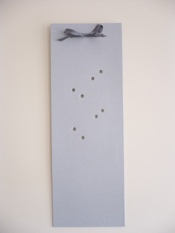 Vous prenez un carton de 2 mm de 40 cm de long. Vous le recouvrez de simili cuir. Vous faîtes deux trous en haut pour passer un ruban, qui va servir à l’accrochage, et d’autres trous au centre